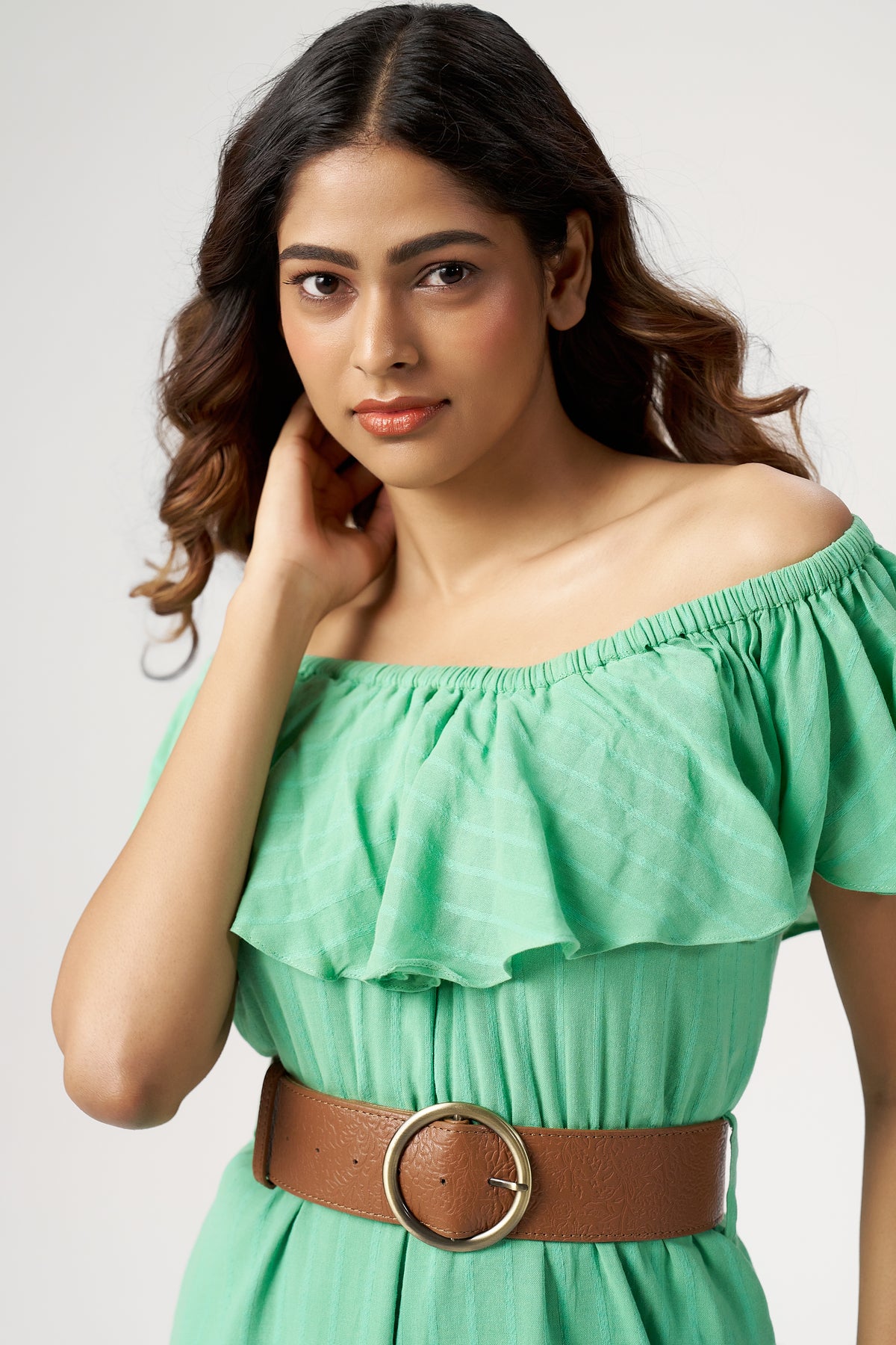 A playful off-shoulder romper in refreshing mint green, adorned with a dramatic ruffle neckline for a breezy, flirty look.