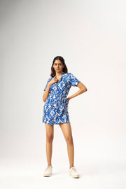 A striking wrap-style tunic in bold indigo ikat print, blending ethnic roots with modern flairNON PADDEDNO ZIPPERSHIRT DRESS WITH WRAP AROUND STYLE COAT COLLARLENGTH 34